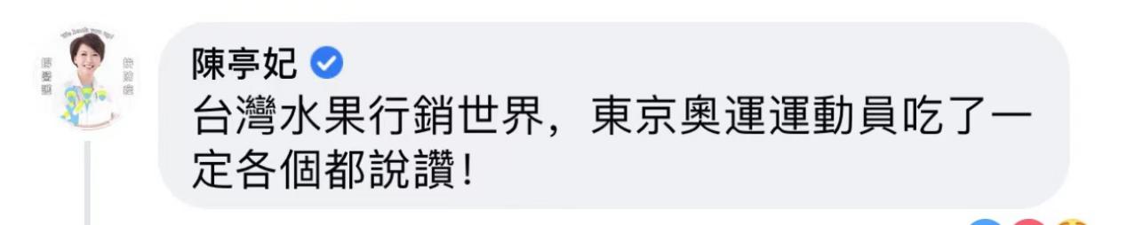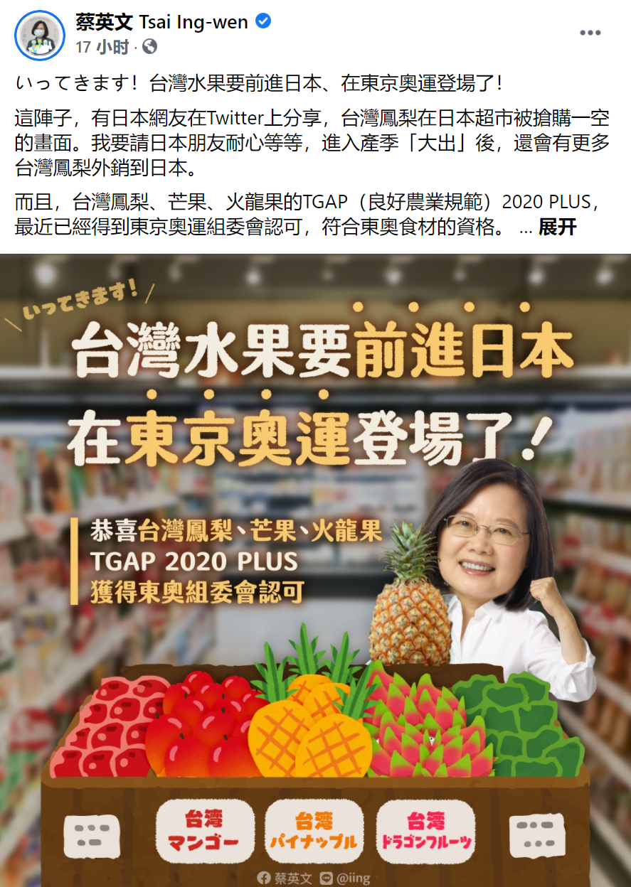 當天,蔡英文在臉書宣稱,“台灣水果要前進日本、在東京奧運登場了。”她還自我吹捧稱,奧運對食材選用有嚴格標準,台灣水果獲得認可,就表示“受到國際高水平的肯定”。