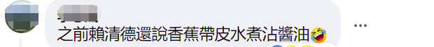 還有網友想起了台當局副領導人賴清德此前提出的“香蕉帶皮水煮蘸醬油”的奇葩吃法,諷刺稱:“這下不能水煮香蕉皮了”。↓