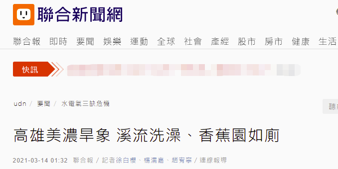 【環球網綜合報道 記者趙友平】台灣“聯合新聞網”3月14日消息稱,台灣乾旱,未安裝自來水管線的高雄美濃地區上千户居民近日發現水井枯竭,無水可用,有人被迫到河裏洗澡,或是在蚊蟲叢生的香蕉園如廁。