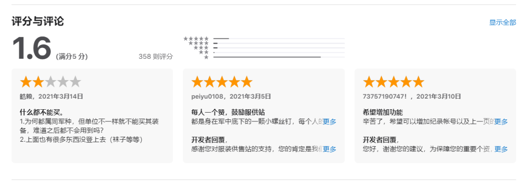 除了門店外,台軍還表示這些服裝店目前還開設了線上下單的APP,但從網上搜索結果看,目前顯示有多個不同的APP,標誌和名稱也並不統一,且其中一個名為“‘陸軍’服裝供售站”的APP更是被得到了1.6分的低分,因被反饋“無法登陸”而得到了許多差評。