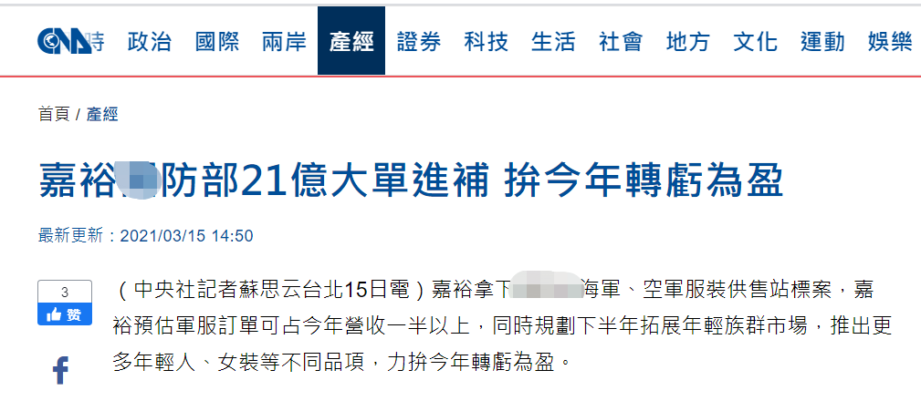 據台媒報道,本次和台軍合作的是台灣嘉裕西服、全聯實業兩家公司。在新聞刊發後不久,台灣“中央社”在報道中提到,本次與台軍的合作將給嘉裕西服帶來約21億新台幣的銷售額,相當於今年該公司營業額的一半。