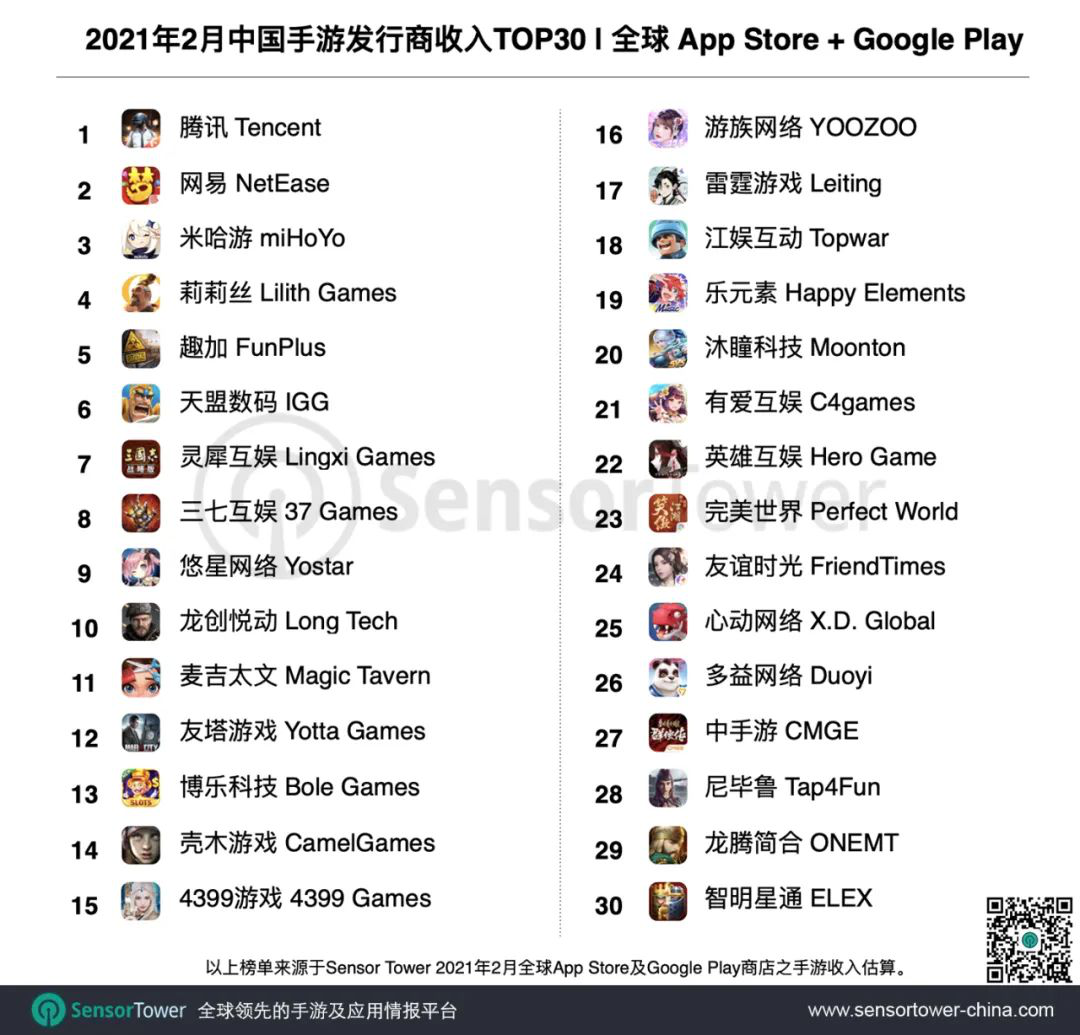 在Sensor Tower最新公佈的2021年2月中國手遊發行商全球App Store & Google Play收入排名榜中,三七互娛較1月再度上升兩位,位列第八。據瞭解,三七互娛的海外整體月流水預計將超過5億元人民幣。有業內人士預測,在精品化、多元化、全球化的策略下,三七互娛豐富的遊戲品類儲備有望令其海外營收在2021年再攀高峯。