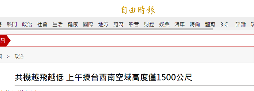 綠媒緊盯:“共機”今日進入台西南空域,飛行高度最低僅1500米