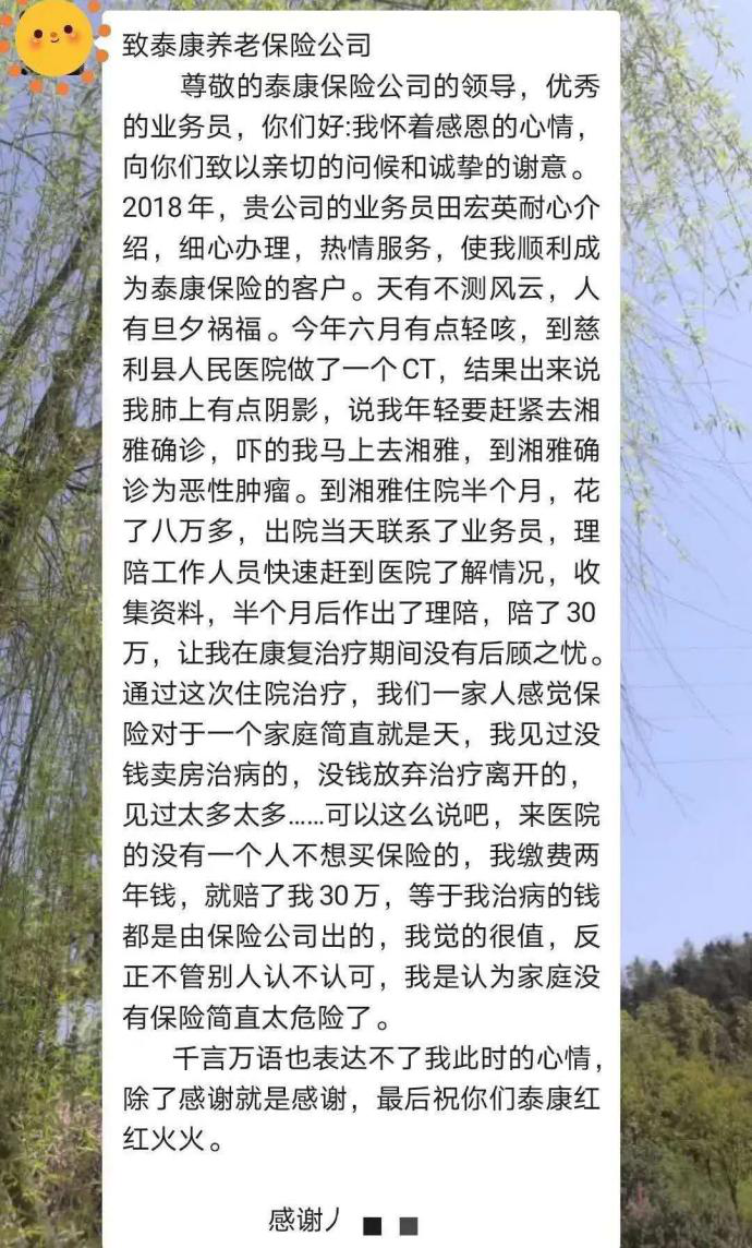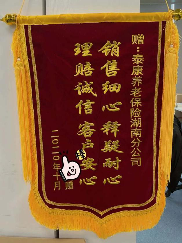 為表示感謝,黃女士向泰康養老湖南分公司贈送了錦旗,併發來了感謝信。黃女士在感謝信裏寫道:感謝業務員的耐心講解,感謝理賠人員的熱心服務,感謝公司優秀的產品,僅交了兩期保費共1萬多元,實際賠付了30萬元!