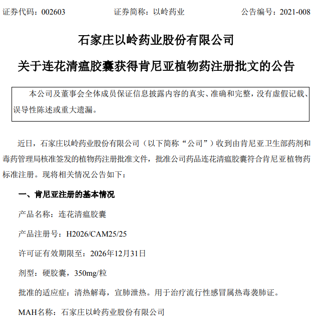 3月16日,以嶺藥業發佈公告稱,該公司近日收到由肯尼亞衞生部藥劑和毒藥管理局核准簽發的植物藥註冊批准文件,批准其產品連花清瘟膠囊符合肯尼亞植物藥標準註冊。