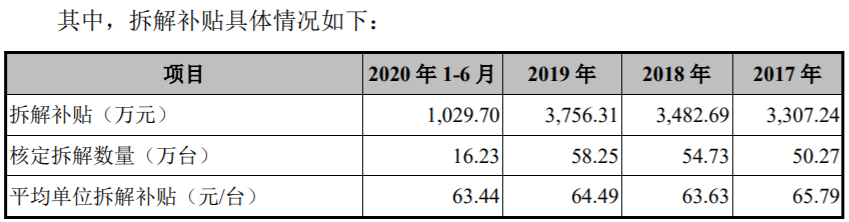 招股書披露,大地海洋的電子廢物拆解補貼的單位基金補貼金額,在報告期內一直高於70元/台,但是同期超越環保的單位基金補貼金額卻一直保持在65元/台的價位,也即大地海洋的單位基金補貼金額一直高於超越環保。