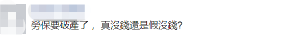 還有網友罵民進黨當局:“打腫臉充胖子,真悲哀。”“勞保要破產了,真沒錢還是假沒錢?”↓