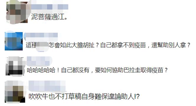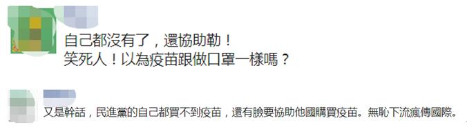 還有網友批評民進黨當局,“泥菩薩過江(自身難保)。”“自己都拿不到疫苗,還幫助別人?”↓