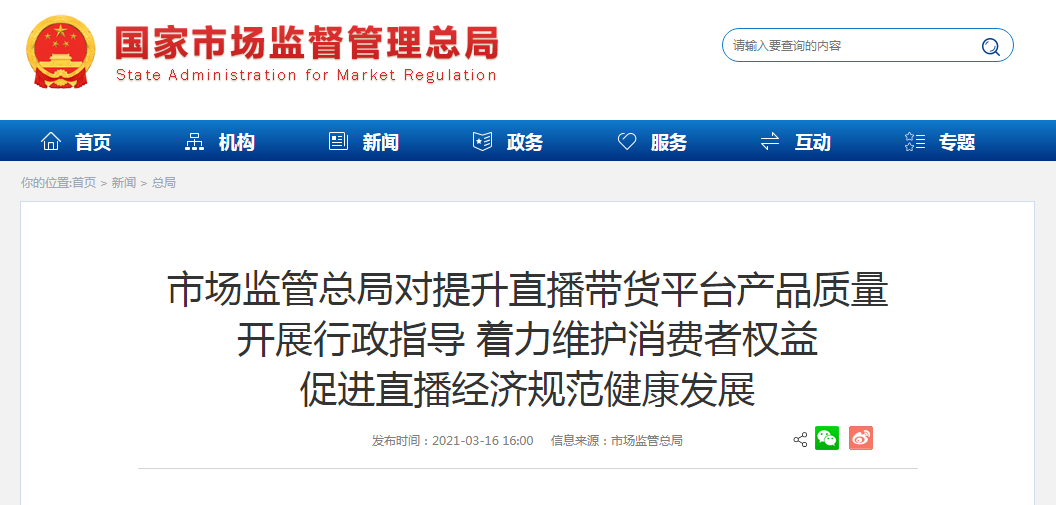 【環球網 記者 陳超】3月16日,環球網記者從國家市場監督管理總局瞭解到,為提高直播帶貨產品供給質量,保護消費者權益,維護直播帶貨市場公平競爭秩序,促進直播經濟規範健康發展,更好服務擴大國內市場,近日,市場監管總局對提升直播帶貨平台產品質量組織開展了行政指導。