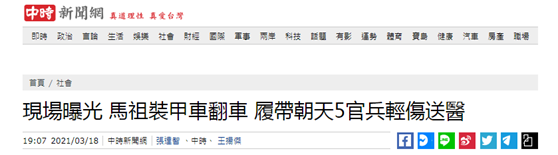 【環球網綜合報道 記者趙友平】台灣“ETtoday新聞雲”剛剛消息稱,台灣陸軍“馬祖防衞指揮部”南竿守備大隊一輛CM-21裝甲車,今天(18日)在南竿撞山翻車,5名官兵緊急送醫。