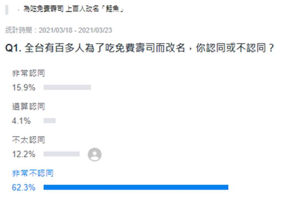 據中時新聞網報道,針對台灣人跟風改名“鮭魚”就是為了吃免費壽司,“Yahoo奇摩”網站對此話題進行網絡民調調查,結果發現,截至18日下午5時,共有6000多名網友投票,其中有74.5%的人不認同(非常不認同62.3%、不太認同12.2%)。