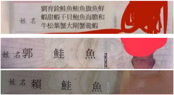 報道稱,台中一名郭姓女大學生更名為“郭鮭魚丼飯”,讓台中市户政所人員傻眼説“前所未見”;高雄一名男大學生改名為“賴鮭魚肚”,他母親勸退不成只好尊重;桃園一名21歲的薛姓男子改名為“薛鮭魚大師”;基隆市一名警察,也改名為“宜蘭之子超粗大深海鮭魚王”。