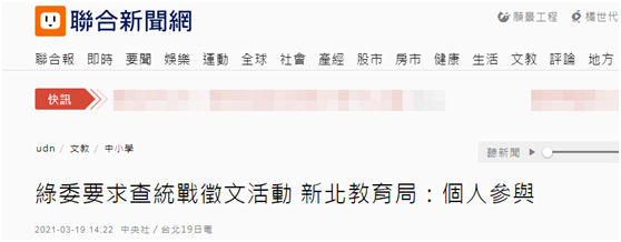 新北市教育局則表示,經過調查,發現參與徵文活動的新北市學生是個人蔘與。新北市教育局還稱,將提醒各校師生,參與各項競賽前應瞭解其辦理單位、目的及內容是否適切,並以切合教育意義為原則。