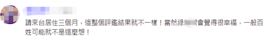 不過,對於台灣外事部門的表態,有島內網友稱,請來台居住三個月,這整個評鑑結果就不一樣!當然綠營會覺得很幸福,一般百姓可能就不是這麼想!↓