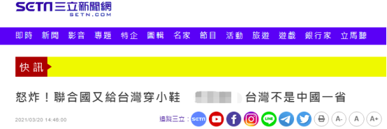 “三立新聞網”今天(20日)下午在報道台外事部門的表態時頗為激動,在報道標題中出現“怒炸!”“聯合國又給台灣穿小鞋”等字眼。