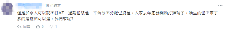 也有網友説,“加拿大可以説不打AZ(阿斯利康),過期也沒差,平台分不分配也沒差,人家去年底就開始打輝瑞了,強生的也下來了,多的是疫苗可以選,我們家呢?”