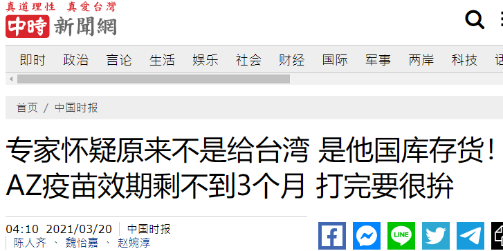 報道提到,台灣盼了大半年的疫苗終於到貨,理應當喜事處理,但不僅台“衞福部長”陳時中在3日當天狀況外,蔡英文辦公室當天對於阿斯利康疫苗的到貨也異常低調,外界即感到其中有些蹊蹺。報道稱,付出一樣的錢,甚至可能更貴,卻只能拿到效期只剩一半的疫苗,未來接種不及只能銷燬,造成損失,“衞福部”沒有失職?“衞福部”應對外説明究竟是如何取得這批疫苗,難不成就連疫苗的有效期限也是商業機密?