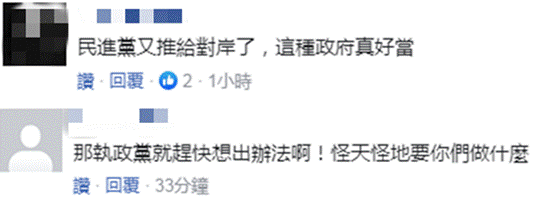 對於吳怡農“共軍侵擾”的説法,有網友在台媒評論區留言批評,“民進黨又推給對岸了,這種‘政府’真好當。”“那執政黨就趕快想出辦法啊!怪天怪地要你們做什麼。”