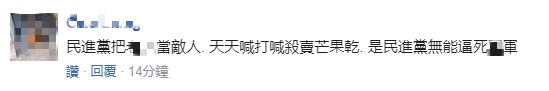 還有人表示,“每次一旦有發生什麼不好的事,除了罵大陸,民進黨人拿不出任何辦法來解決問題。”“民進黨把大陸當敵人,天天喊打喊殺賣芒果乾,是民進黨無能逼死台軍。”