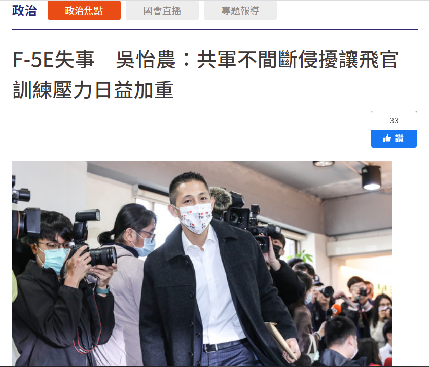 路透社這個説法,和島內某些習慣向大陸“甩鍋”的人不謀而合。民進黨籍政客吳怡農也表示,本次事故的原因是大陸軍機“不間斷地侵擾,導致台軍的戰備和訓練壓力日益加重”。