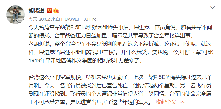 這篇報道的後文還稱,台軍“空軍”訓練有素、裝備精良,配備了大量美式裝備。可從目前披露的情況看,這八個字的評語,台軍似乎一個都靠不上。