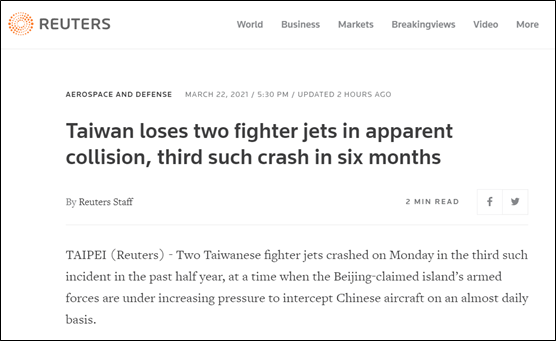 22日,台軍2架戰機在訓練中碰撞導致墜海,目前已有一名飛行員確認死亡。不過,路透社在報道此事時,卻把台軍這次訓練事故怪到了大陸頭上。