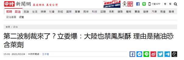 由於多次從台灣菠蘿(台灣多稱鳳梨)中檢出有害生物,海關總署日前宣佈從3月1日起暫停台灣地區菠蘿輸入大陸。台當局和民進黨政客沒有把心思放在加強農產品安全檢疫上,而是進行政治化操弄,一面推卸責任渲染“中共打壓”,一面大喊“吃鳳梨、救台灣”的口號。在台當局大張旗鼓的鼓譟下,從“政客帶頭大口啃”,到“台軍伙食中加鳳梨”,再到所謂“捍衞自由鳳梨”,各種“花式吃法”成為島內輿論場上一道“奇景”。甚至有台灣“名嘴”宣稱,每個台灣人只要1天吃18公斤鳳梨,連吃兩週就好了。