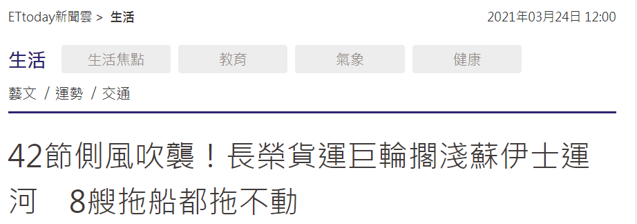 另據聯合新聞網報道,消息傳回台灣,台灣交通部門稱,根據“航港局”回報,長榮海運這艘船因遇到42節側風吹襲,導致目前擱淺在蘇伊士運河,昨天已找了8艘拖船試圖將其拖回原航道,但沒有成功,現在等高潮位再嘗試拖困,如仍有困難,一般會考慮卸除貨載,並已洽請專家及保險公司尋求解決方案。