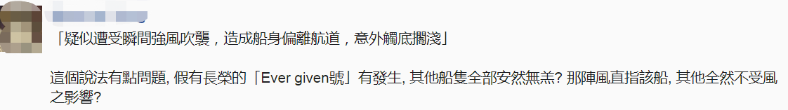 也有網友對“疑似遭受瞬間強風吹襲造成船身偏離航道”的説法有疑議:“這個説法有點問題, 假有長榮的‘Ever given號’有發生, 其他船隻全部安然無恙? 那陣風直指該船, 其他全然不受風之影響?”↓