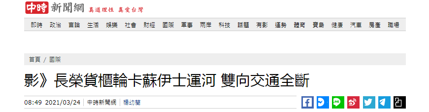 【環球網報道 記者 趙友平】台灣中時新聞網等多家台媒3月24日消息稱,台灣長榮海運的超大型貨櫃輪“長賜”號(Ever Given)23日在從中國大陸深圳市鹽田駛向荷蘭鹿特丹的途中,卡在蘇伊士運河,導致這條全球數一數二繁忙的運河雙向交通大阻塞。對此,台灣交通部門“航港局”稱,該船因為昨天遇到42節側風(相當於9級風)吹襲導致擱淺,已找到8艘拖船試圖拖回原航道,但沒有成功。