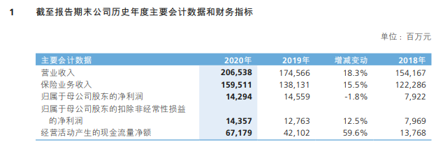 據新華保險年報,2020年,該公司實現營業收入2065.38億元,同比增長18.3%;實現保費收入1595.11億元,同比增長15.5%;實現歸屬於母公司股東的淨利潤142.94億元,同比下降1.8%。歸屬於母公司股東的扣除非經常性損益的淨利潤143.57億元,同比增長12.5%。
