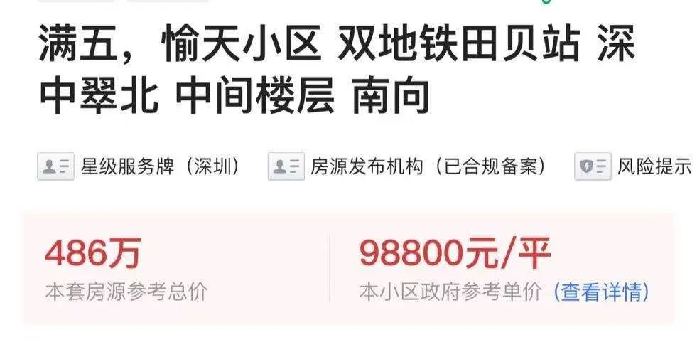 走在田貝四路和貝麗南路,許多培訓機構的廣告和深圳中學初中部的學位房廣告信息非常引人矚目,最然周邊多數為樓齡近20年甚至超過20年的小區,但因為優質學位的“加持”,價格水漲船高。以上世紀80年代建設的愉天小區為例,由於户型面積小,帶深圳中學初中部和翠北小學雙優質學位,而且帶有可能的拆遷概念,一直是學區房投資者關注的小區。記者調查發現,目前該小區的二手房成交參考價為每平方米98800元,但一套35平方米的房源業主掛牌價已經高達670萬,摺合約每平方米19萬元。“去年5月同户型的成交價還在465萬元左右,前年同户型的成交價還在每平方米9萬元,漲幅非常驚人。”胡經理表示,“春節過後優質學區房的需求還是很大,對於這種小户型,很多客户都選擇一次性付款,所以不受參考價的影響。”