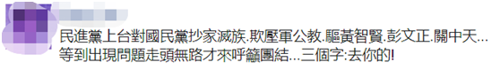 對此,有島內網友罵民進黨當局,“民進黨上台對國民黨抄家滅族,欺壓軍公教(軍人、公務員、教師),驅黃智賢、彭文正,關中天……等到出現問題走投無路才來呼籲團結……(送你)三個字:去你的!”↓