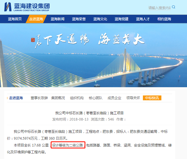 不僅如此,根據《2020年度禹州市普通幹線公路改建工程-評標公示》,第二中標候選人為“藍海建設集團有限公司”。該公司自主申報的投標業績“石長路(棗巷至長臨段)施工”資料顯示,項目等級為一級公路;然而,安徽合肥公共資源交易中心顯示,該項目設計等級為二級公路。藍海建設集團企業官方網站中標快訊一覽同樣顯示“石長路(棗巷至長臨段)施工”項目設計等級為二級公路。