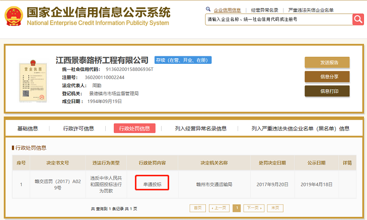 在國家企業信用信息公示系統中,也公示了江西景泰路橋工程有限公司存在行政處罰記錄,內容為“串通投標”。