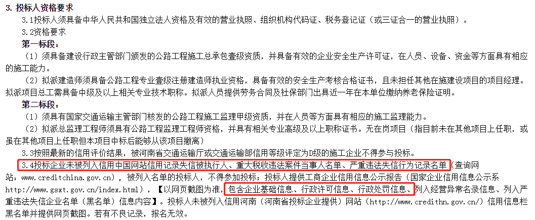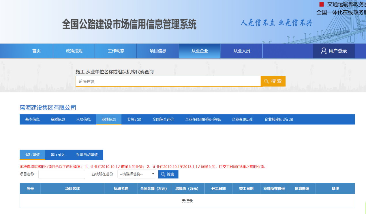 本次招標文件投標人須知中明確規定,“投標人對評標過程中提供的材料負責,如提供偽造材料未能識別,中標後經調查發現,將取消中標資格、沒收投標保證金,並將該信息提交相關部門列入誠信體系。”但截止環球網記者發稿前,藍海建設集團尚未被取消第二中標候選人資格。而且通過全國公路建設市場信用信息管理系統查看顯示,目前藍海建設所有業績已被平台刪除。