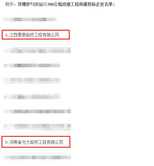 公開資料顯示,早在2017年3月贛州市人民政府辦公廳《關於印發<整治工程項目建設招標投標秩序 嚴厲打擊違法行為專項活動方案>的通知》(贛市府辦字【2017】20號)文件,公佈的一批涉嫌參與安遠G358公路改建、信豐G105繞城改造工程串通投標企業名單當中,同時出現了“江西景泰路橋工程有限公司”和“河南省光大路橋工程有限公司”這兩家公司的名字。