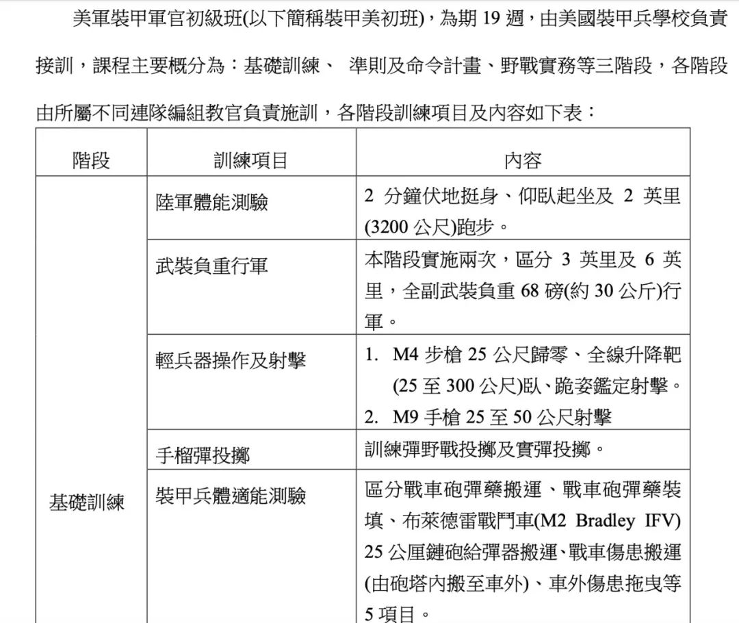 據台灣省媒體此前報道,台軍裝甲兵曾多次赴美國裝甲兵學校接受培訓。一份台相關部門於2018年公佈的報告介紹稱,赴美培訓,旨在培養初階台軍裝甲軍官指揮機甲部隊的作戰之能力,並比較與台軍訓練的異同,藉以精進台軍訓練。這份報告中還詳列的台裝甲兵在美培訓的內容,其中包括陸軍體能測驗,輕兵器射擊,裝甲兵種體適能測驗,12英里武裝負重行軍,地圖判讀暨定向越野,戰車炮及車裝機槍射擊,針對戰車排攻擊、防禦及偵查排準則實施測驗,命令計劃作為,戰車、裝騎對抗演習及混兵種對抗演習等10類指標性訓練項目與一般課程。
