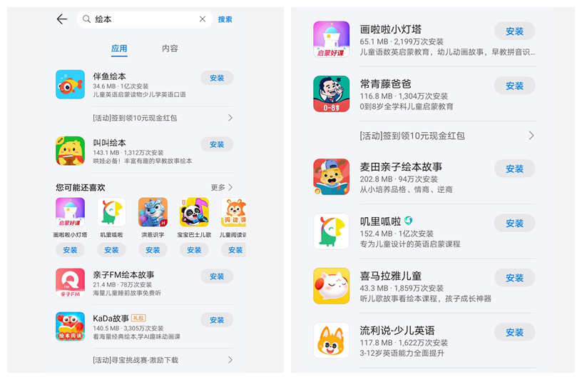 與此同時,線上繪本館也是“百花齊放”,在某應用商城搜索“繪本”二字,“哄娃必備”、“看海量經典繪本”、“聽兒歌故事看繪本課程”躍然眼前,為兒童設計的繪本APP可謂是多彩多樣,更有多個繪本APP超億次安裝量。據悉,兒童在線教育平台斑馬AI課等也已瞄準繪本館市場,於近日在其官方App內上線“繪本館”板塊。
