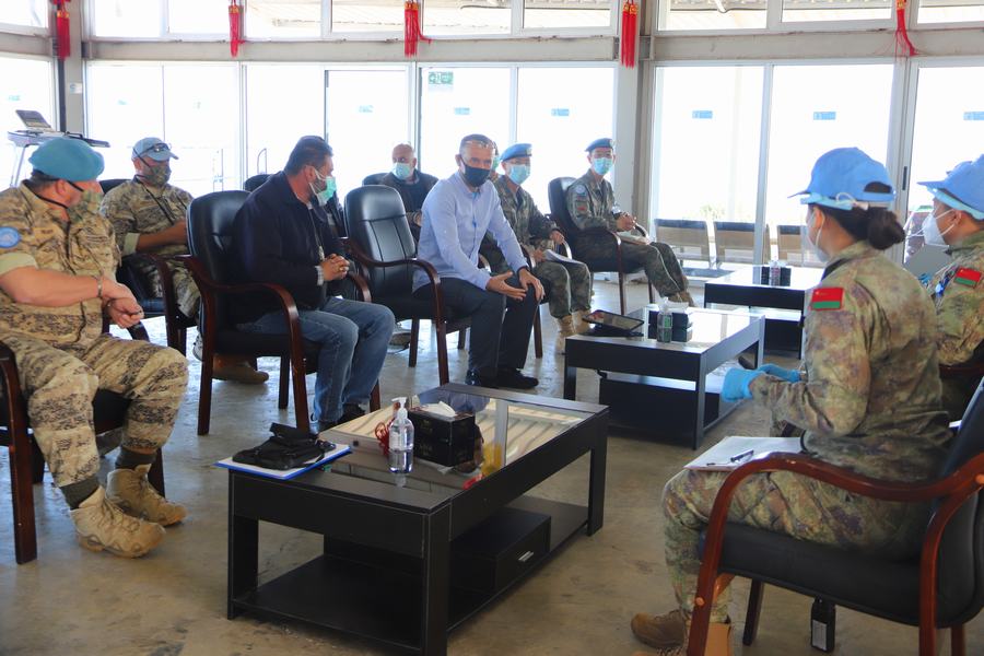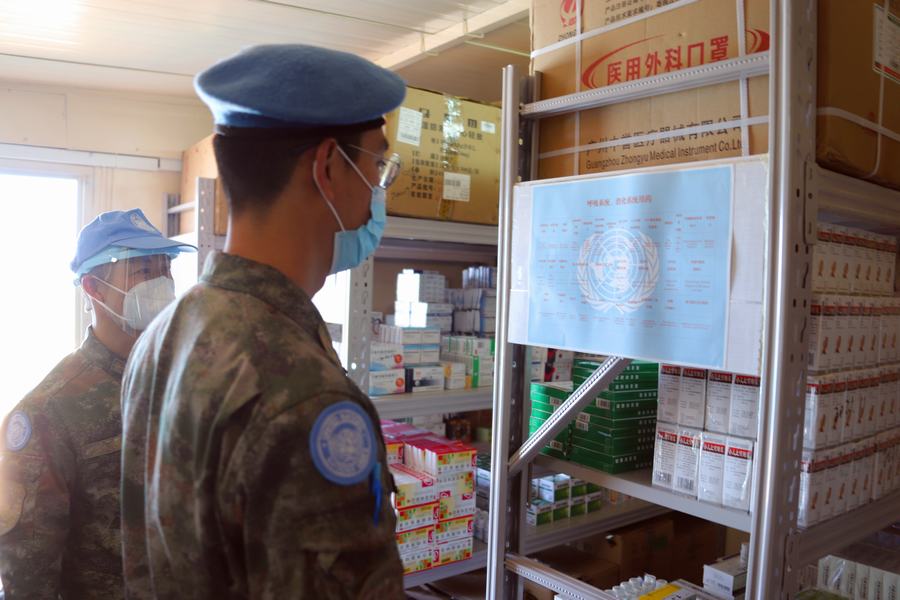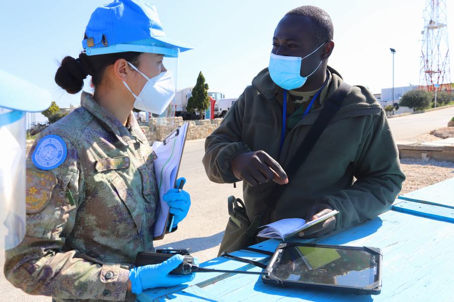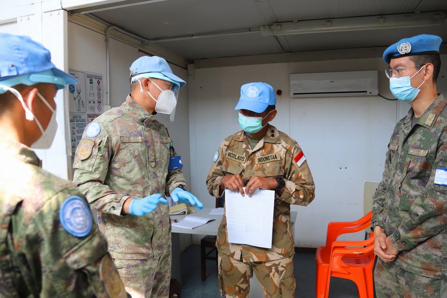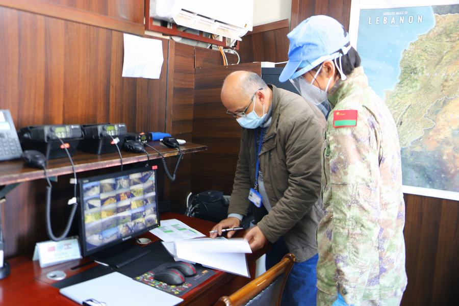 為了有效應對疫情,建築工兵分隊對核查人員和車輛入營前進行嚴格消毒和體温檢測,所有翻譯及陪同人員都穿戴齊全的防疫裝具,並保持一定的接觸距離。“檢查內容包括一級醫院人員配置、藥品裝備管理,醫療救治及後送能力等內容,涉及面廣,檢查非常仔細。”在一級醫院核查時,陪同的院長王文俊介紹,他們自部署以來嚴格制定落實了分級分區管理、日常消殺滅和體温監測等20餘項防疫措施,確保了維和官兵的零感染和零確診率,相關防疫措施還在聯黎部隊得到推廣。