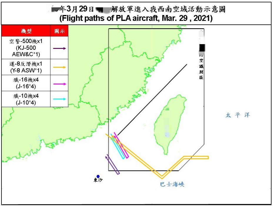 據台灣《聯合報》29日報道,日本防衞省統合幕僚監部29日發佈消息,稱2架解放軍軍機當日穿越宮古海峽飛抵台灣東岸遠海空域。報道提到,台防務部門29日也發佈10架次“共機”進入台西南空域的動態,其中1架次運-8反潛機穿出巴士海峽進入台灣東部空域。報道稱,結合日方資訊,航跡恰與日方公佈2架“共機”“會合”,形成“繞台”、“包台”之勢。不過,因無明確時間點,無法證實兩批軍機29日是否曾在台灣東岸會合操演。