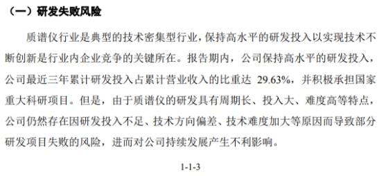 但事實上,回顧禾信儀器在2019年6月發佈的招股書中,其中涉及到的“重大事項提示”中,“廣告色彩”更濃。以“研發失敗風險”為例,在2019年6月發佈的招股書中提到“報告期內,公司保持高水平的研發投入, 公司最近三年累計研發投入佔累計營業收入的比重達 29.63%,並積極承擔國家重大科研項目”,在本次招股書中則未見有此內容表述。
