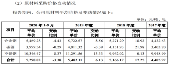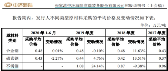 再來看海鍋股份的經營數據,根據招股書披露,海鍋股份與中環海陸互為同行業可比公司,兩家公司的主營業務均包含風電設備鍛件生產,主要原材料均包括合金鋼、碳鋼、不鏽鋼等。根據海鍋股份披露,2019年合金鋼採購單價為0.57萬元/噸,而中環海陸同年採購合金鋼單價則僅為0.48萬元/噸,兩家公司採購單價偏離值將近20%。