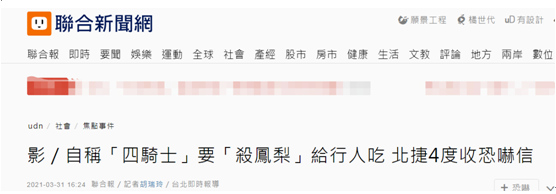 報道稱,台北市警察局捷運警察隊今天(31日)下午發佈新聞稿稱,北捷公司上午接獲自稱為“四騎士”的人發來的恐嚇電子郵件,內容揚言要在龍山寺站“殺鳳梨請行人吃”,並要在3天內開車衝撞台灣“總統府”等。