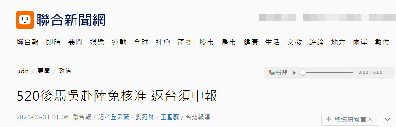 據報道,台灣“總統府”發言人張惇涵30日稱,依照相關法規,馬英九及吳敦義的出境管制期限至今年5月19日屆滿。然而,對於“總統府”出境管制期間屆滿者,若欲前往大陸,仍必須依照“兩岸人民關係條例”規定辦理,返台後應向“總統府”申報。