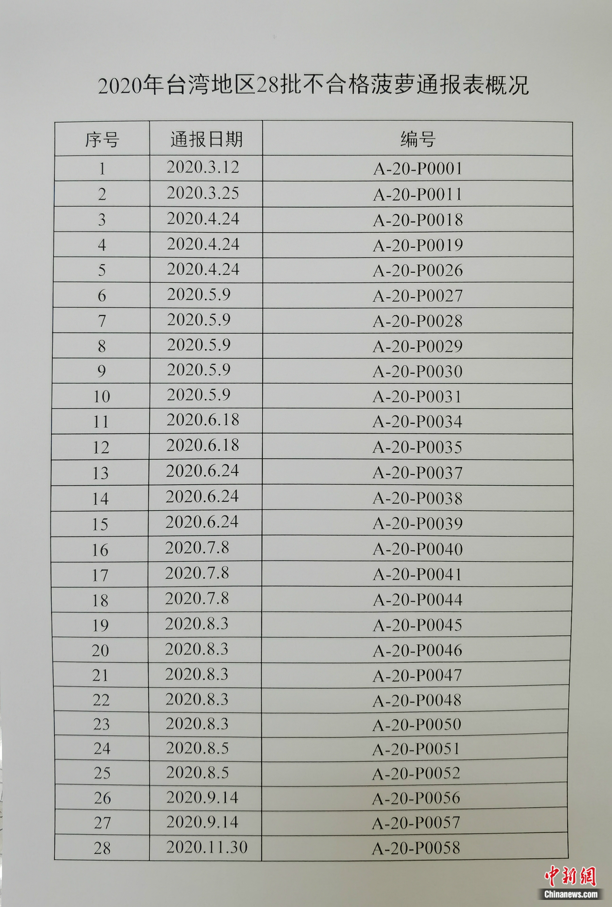 2020年台灣地區28批不合格菠蘿通報表概況。國台辦供圖