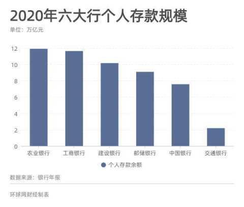 郵儲銀行個人存款達9.1萬億億元,佔全行客户存款總額的比例高達87.8%。中國銀行個人存款7.59萬億元;交通銀行個人存款餘額 2.19萬億元,較上年末增長 11.29%。