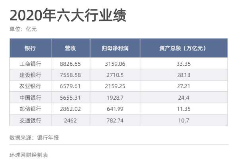 【環球網 記者 譚雅文】截至3月31日,六大國有銀行年報全部出爐。2020年,國有銀行營收和歸母淨利潤均實現正增長,工商銀行營收8826.65億元,歸母淨利潤3159.06億元,資產規模33.35億元,穩居首位。