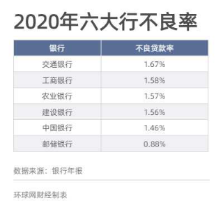 根據年報中披露的資產質量情況,六大行不良貸款率有所上升。具體來看,交通銀行不良率最高且增長幅度最大,不良貸款率為1.67%,增長0.2個百分點,郵儲銀行不良貸款率最低,為0.88%。