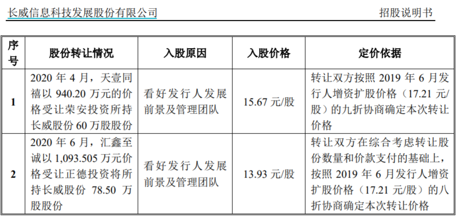 而據招股書顯示,2020年4月29日孫克勝、王建民、許敬霞等三人個人財務安排需要擬轉讓通過榮安投資間接所持發行人股份,以15.67元/股的價格分別轉讓予匯銀龍商和天壹同禧其中匯銀龍商為公司原股東,天壹同禧為新增股東;招股書還披露本次股權轉讓的“定價依據為股權交易當事人以公司最近一次融資定價(17.21元/股)為參考協商確定”。